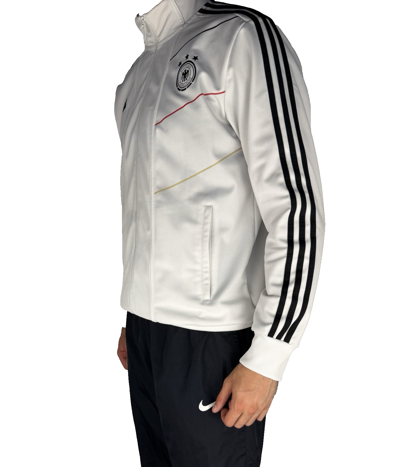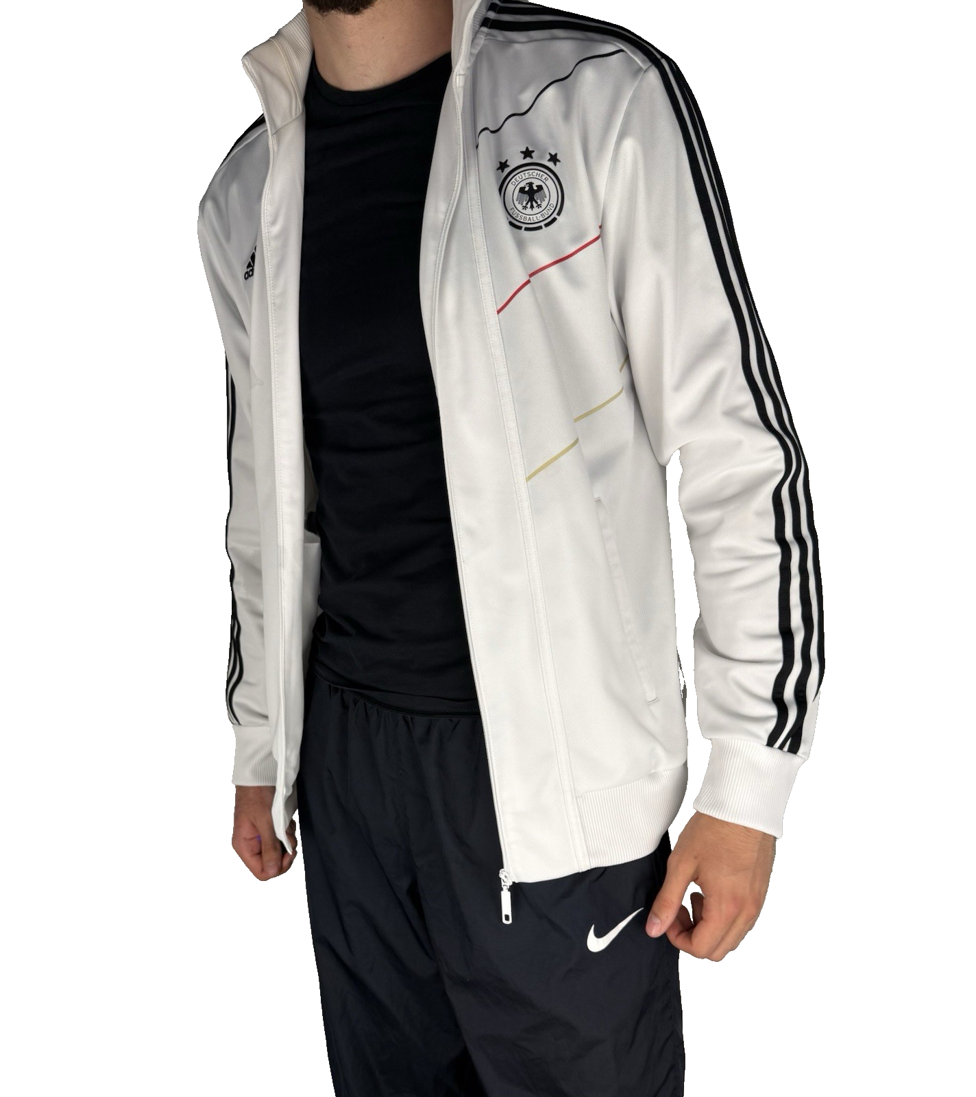 🎨 Farbe: Weiß mit schwarzen Streifen & Details, gesticktes DFB-Wappen mit 3 Sternen